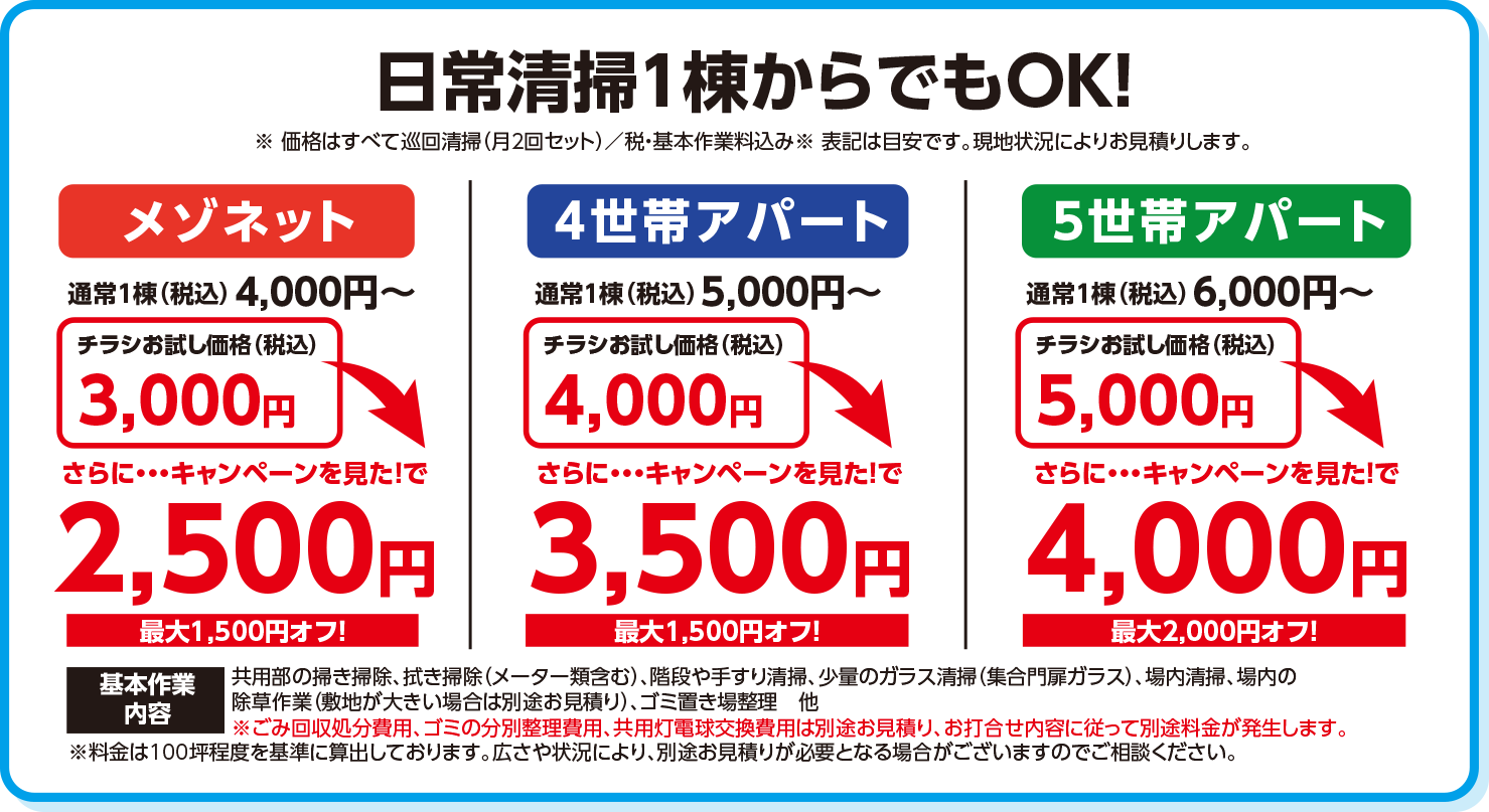 低階層マンション(3階未満)(週1~週6回の清掃)